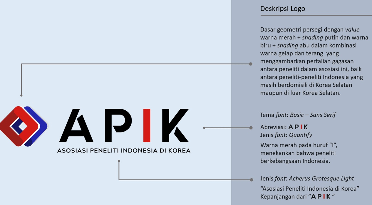 Dasar geometri persegi dengan value warna merah + shading putih dan warna biru + shading abu dalam kombinasi warna gelap dan terang yang menggambarkan pertalian gagasan antara peneliti dalam asosiasi ini, baik antara peneliti-peneliti Indonesia yang masih berdomisili di Korea Selatan maupun di luar Korea Selatan.